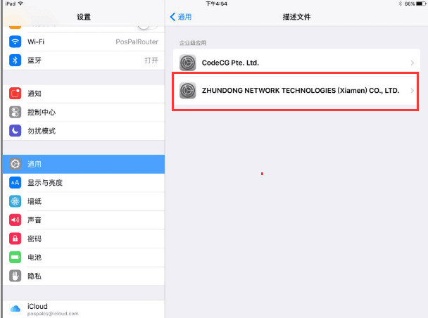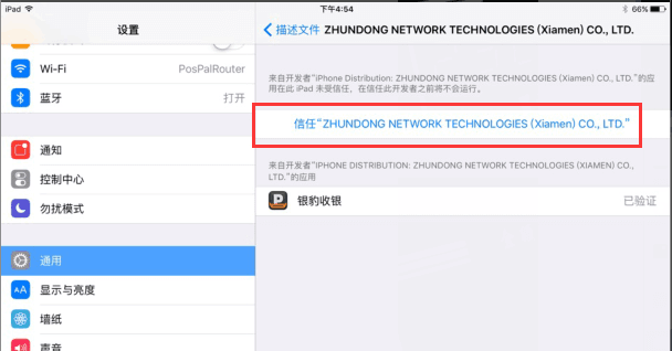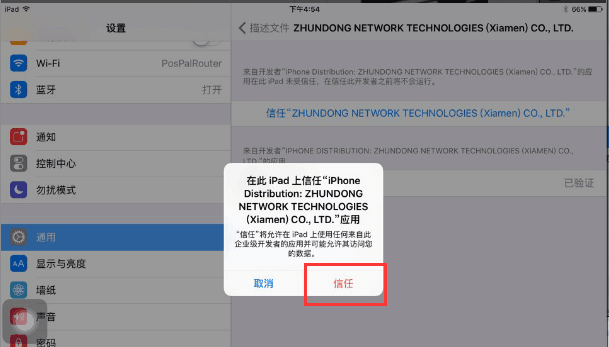 3、如下图点击信任应用程序配置文件‘ZHUNDONG NETWORK TECHNOLOGIES(xiamen)CO.,LTD.’