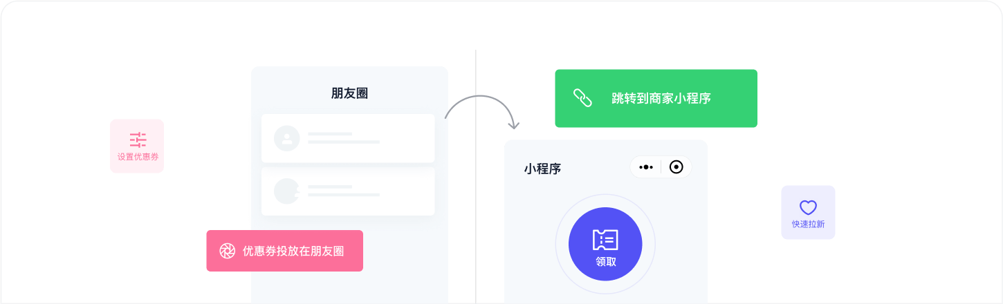 『创银』通过打通小程序与微信广告平台,将门店系统的优惠券投放在微信朋友圈,周边人群在浏览朋友圈时看到商家的优惠券广告,点击后立刻跳转到商家小程序注册领取,实现快速拉新。同时系统支持配置不同场景优惠券,让营销更多样化。