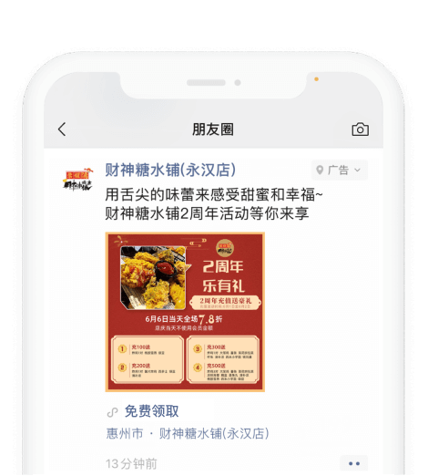 - 财神糖水铺是惠州一家连锁门店,该门店是复投的广告主。此次正值门店2周年店庆,门店开展了为期2天的充值活动。