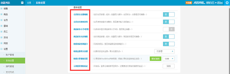基本设置:可进行会员积分余额是否可编辑、商品库存是否可编辑,销售及收银、小票等日常活动的相关设置;
