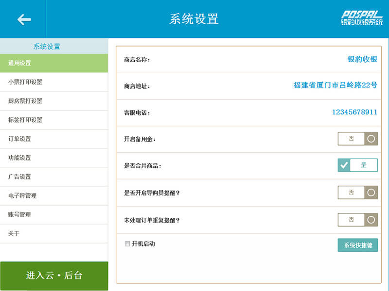选择设置后,进入通用设置:对店铺信息进行编辑,选择是否开启备用金、导购员,未处理订单重复提醒等。