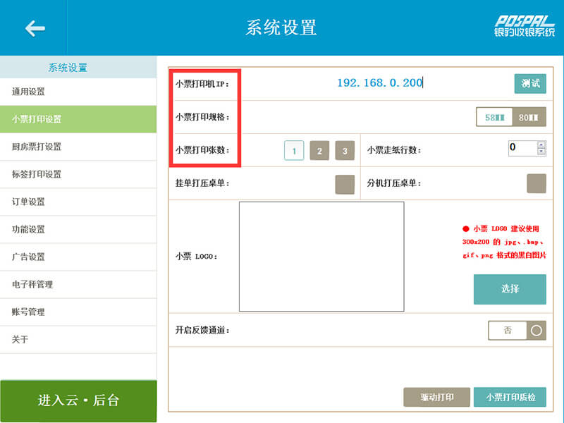 小票打印设置:小票的打印规格可选58mm/80mm,另外可设置小票的打印张数1-3张;如果是网口小票机,需