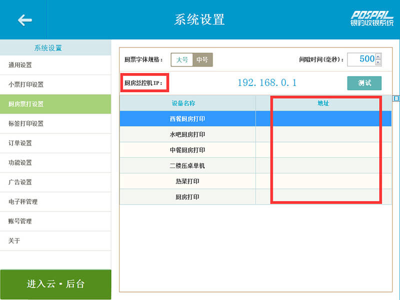厨房票打设置:在厨房总控机IP中,输入对应的总控IP地址,必须与电脑的IP地址处于同一网段。