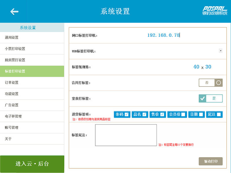 标签打印设置:采用网口标签机时,需要在“标签打印机IP”一栏,填写标签打印机的IP地址,IP必须和电脑IP