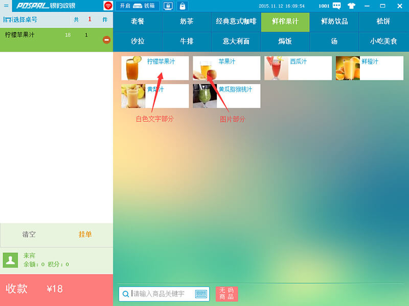 点击商品文字部分(白色区域),该商品将直接添加到收银区域,多次点击同一商品则增加数量。