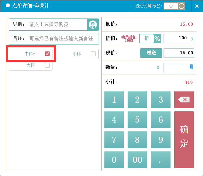 点击某个商品的图片区域,可对该商品的点单口味、数量、折扣、导购员等详细情况进行编辑修改;备注、导购员可直接勾选,数量及折扣须手动输入,折扣也可切换为金额减免。