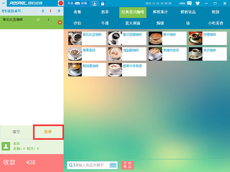 挂单功能适用于堂食的单据,当客人选完商品后,点击收银区域的挂单: