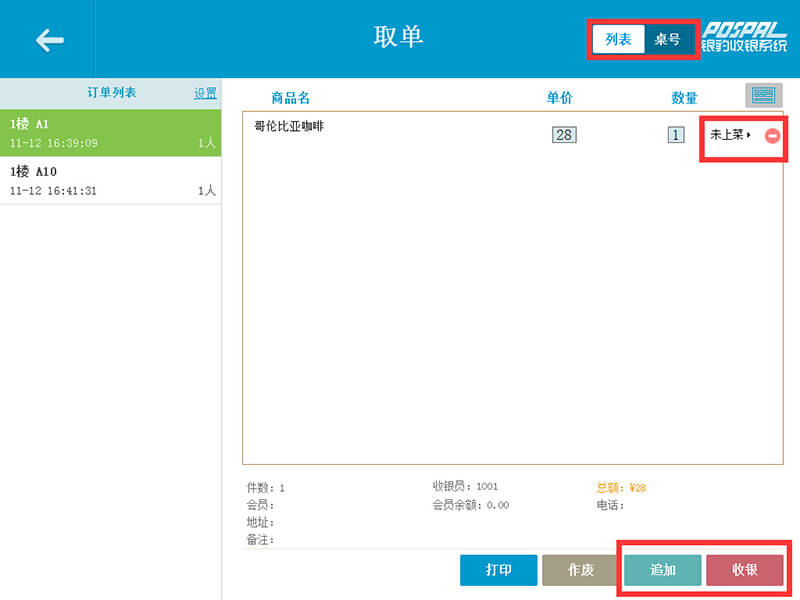 需要对挂单单据进行催菜或结帐操作时,可进入取单界面,在收银区域点击取单选择收银; 取单后,在右上角可选择订单排列方式,在订单界面可对“未上菜”进行催菜,在订单右下角可对该单进行打印,作废,追加,收银等操作。