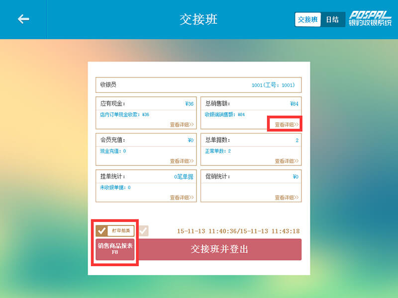 交接班时系统会提供当班汇总信息,包含:总单数,总现金,总销售额等。可在查看详细中查看不同支付收入等更详细的信息。