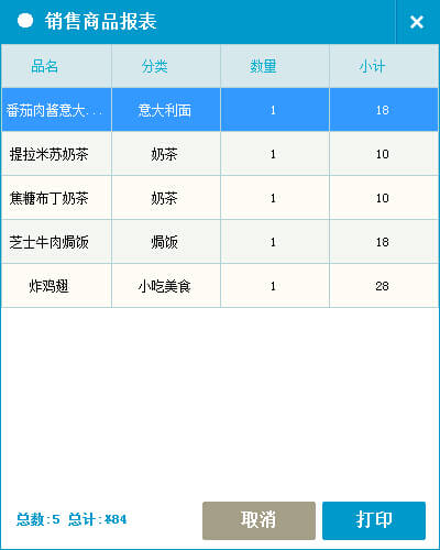 选择销售商品报表,查看店内商品的当日销售情况,包括商品名称、销售数量及总计,可直接打印。