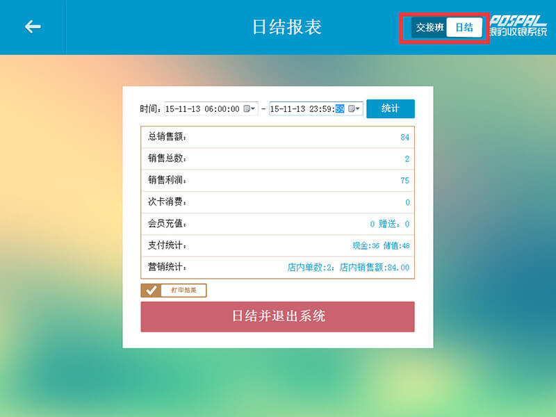 当天结束营业时,选择交接班,可在界面上方切换至日结;下拉选择时间段,进行统计。