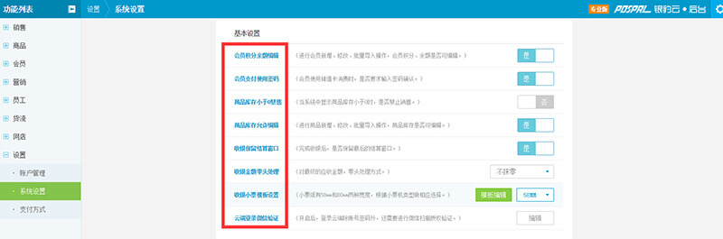 基本设置:可进行会员积分余额是否可编辑、商品库存是否可编辑,销售及收银、小票等日常活动的相关设置;