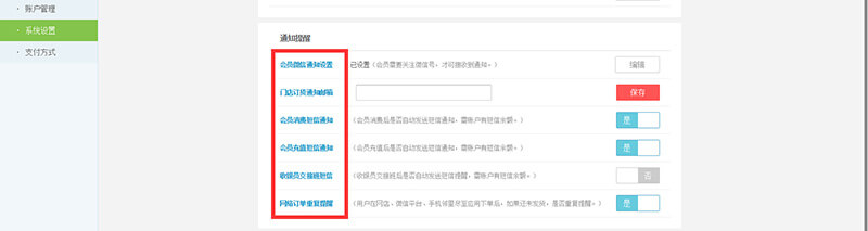 通知提醒:可进行会员消费微信短信通知设置、门店订货通知、交接班通知等实时提醒相关设置