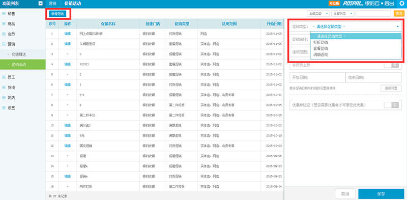 除了充值赠送,还有多种营销策略可供选择,进入促销活动>新增促销,可选择打折、套餐、满额返现等促销活动