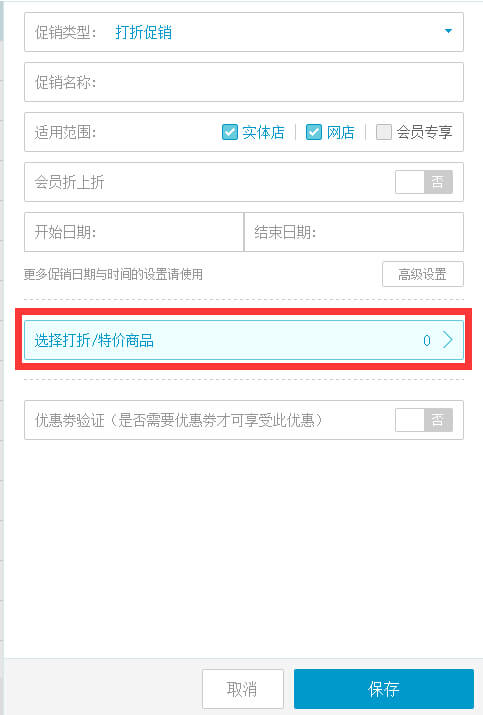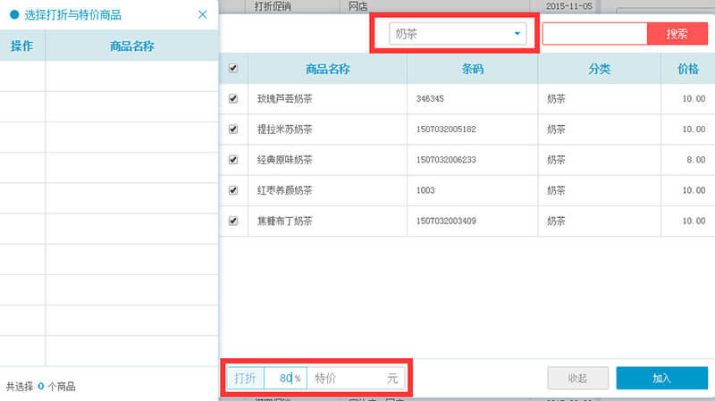 打折促销:打折特价商品可按分类进行选择,亦可选择进行折扣处理还是特价销售。