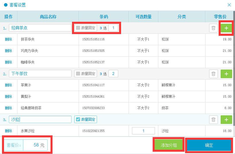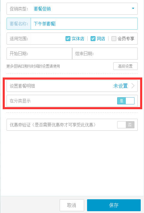 套餐促销:套餐明细中可对套餐包含的商品进行设计,可做可选套餐的设置,如某一类商品中选一或二样