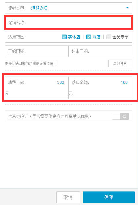 满额返现:直接输入允许返现的消费金额和返现金额即可完成设置