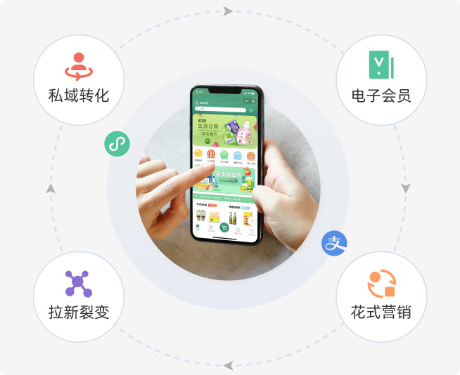 如果有进阶需求,可以配合 商城小程序 ,开通线上服务,让会员在家云逛店,商家配送上门;或开通 外卖平台的对接 ,配送至更远的距离。